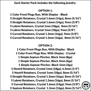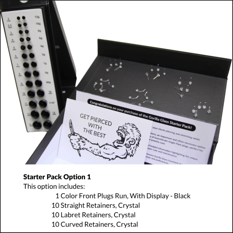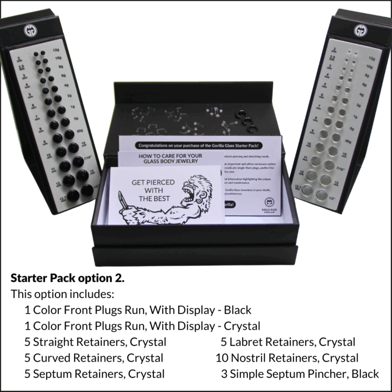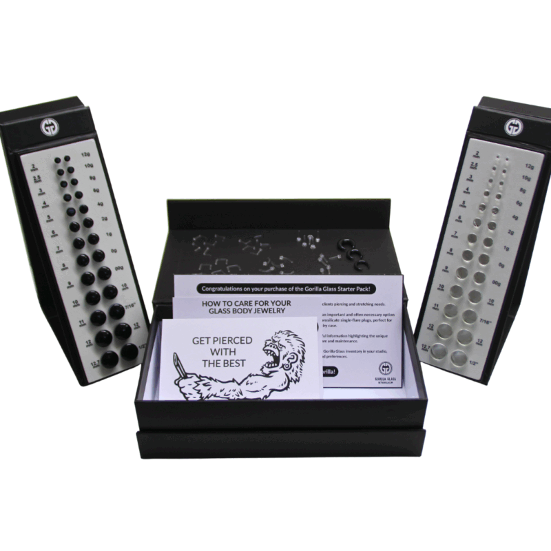 The STARTER PACK has the essential tools to offer high-quality glass jewelry for your clients piercing and stretching needs.
